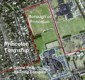 This image of PHS from above (with old municipal boundaries pre-dating the January 1, 2013, consolidation of Princeton highlighted) predates the 2000s construction. The building complex to the right of the athletic fields and track is Princeton Unified Middle School, also pre-construction.