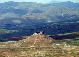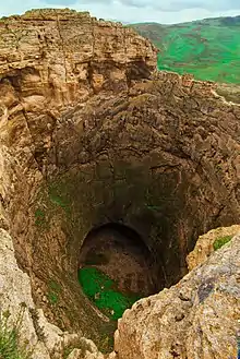 The Prison of Solomon (Persian: زندان سلیمان, romanized: Zendān-e Soleymān) is a hollow cone shaped hill in West Azerbaijan Province, Iran. There is an 80 meters deep pit in the middle of the hill, and the entrance to the pit is roughly 65 meters in diameter.[1][2]