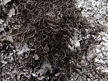 Pseudephebe pubescens is a fruticose lichen that forms decumbent mats made of isotomic-dichotomous branching thalli. The branching occurs frequently and weaves around itself, leading to the woolen appearance. Dark brown to black in color and shiny.[5] Apothecia are rare, but are rarely greater than 6 mm in diameter and have the same appearance as the rest of the thallus.[6] The species lacks isidia, soredia, and pseudocyphellae.[3] Pycnidia occur in great numbers on tubercles with conspicuous ostioles. It is not known to produce any secondary metabolites.[7]