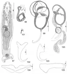 Pseudorhabdosynochus contubernalis is a small monogenean. The species has the general characteristics of other species of Pseudorhabdosynochus, with a flat body and a posterior haptor, which is the organ by which the monogenean attaches itself to the gill of is host. The haptor bears two squamodiscs, one ventral and one dorsal. The sclerotized male copulatory organ, or "quadriloculate organ", has the shape of a bean with four internal chambers, as in other species of Pseudorhabdosynochus.[2] The vagina includes a sclerotized part, which is a complex structure.