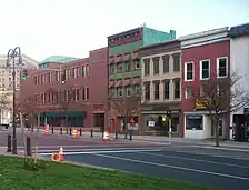 On May 13, 1849, a fire started inside the American Hotel, killing one. Most of Public Square and buildings on three adjacent streets were destroyed.[4] The fire destroyed nearly all of the business portion of the city, including three banks, post office, three printing offices, two hotels, and thirty stores.[5] The square was immediately rebuilt for $250,000 (Now $8,794,000).[6] Several buildings erected during the rebuilding still stand. In the rebuilding of the 1850s, the city created three parks at the square's center, with a fountain inside the center park. During Watertown's industrial boom in the late 19th and early 20th centuries, Public Square became the heart of Watertown's retail, business and social life. In the 1950s, the three parks in the square's center were combined into one large park.