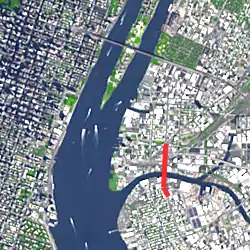 In 2012, in response to the lack of adequate bicycle facilities currently on the Pulaski Bridge, the NYC Department of Transportation began studying the possibility of installing dedicated bicycle lanes on the bridge.[8] Since the Pulaski is a drawbridge with an open section in the middle, it presents several challenges not faced by other bridges. First, physical dividers must be lightweight yet securely installed so they don't come loose when the drawbridge is opened. Secondly, the joints where the two leaves come together must be somehow protected to make them more bicycle wheel-friendly. In April 2013, in a letter to Assembly Member Joe Lentol, the NYC Department of Transportation Commissioner stated that the proposal for a two-way dedicated bike lane, which would convert the existing walkway to a pedestrian-only path, had met the requirements of a traffic analysis and that an engineering study and recommendations would be made by the end of the year.[9] On October 25, 2013, Lentol announced that the DOT was in the process of designing a dedicated bike lane and that the final design would be presented to community board 1 in Brooklyn and Community Board 2 in Queens before the end of the year. Bike lane construction was originally projected to occur late spring or early summer of 2014.[10] Construction occurred during the winter of 2015 and the bike lane opened at the end of April 2016.[11]