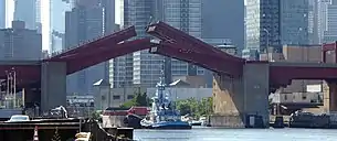 The Pulaski Bridge opened to traffic on September 10, 1954.[5] It served as a replacement for the nearby Vernon Avenue Bridge, which had linked Vernon Avenue (now Vernon Boulevard) in Long Island City with Manhattan Avenue in Greenpoint.[2]