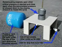 Most conventional drip irrigation systems can be made to pulse by using a timer to reduce the watering duration and increase the watering frequency.[1] Some newer systems have been developed that utilize a pressurized reservoir. When the pressure in the reservoir reaches some predetermined pressure level the valve on the reservoir opens and a portion of the fluid contained within the reservoir is forcefully discharged. While the fluid is discharging, the pressure within the reservoir decreases. When the decrease in water pressure reaches a predetermined level the valve closes to resume the charging phase. The charge-discharge cycling will continue as long as the flow rate coming in through the inlet is less than the expel rate passing out through the outlets while the valve is open. A device called a drip flow controller is placed at the inlet for this purpose to regulate the flow into the inlet.