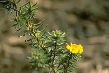 Pultenaea echinula, commonly known as curved bush-pea,[2] is a species of flowering plant in the family Fabaceae and is endemic to a small area of New South Wales. It is an erect shrub with linear, needle-shaped, grooved leaves, and dense clusters of yellow to orange and red flowers.