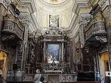 To the left of the altar is the funeral monument of Giulio Mastrillo, by Andrea Vaccaro. Above the main altarpiece in the cupola is a canvas by Giacomo Farelli: St Anne offers the child Virgin Sant’Anna to God the father ( 1670 ) as well as a Victory of St Michael (165) by Girolamo De Magistro.[2]
