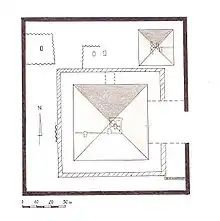 The pyramid complex comprises the main pyramid enclosed by two walls. The outer one, made of mudbrick, contained in the north-east corner a small subsidiary pyramid, the only one known dating to the 13th dynasty. The inner enclosure wall was made of limestone and patterned with niches and panels.[1] This replaced an earlier mudbrick wavy-wall, which led Rainer Stadelmann to suggest that the wavy-wall was constructed as a provisional and abbreviated substitute to the more time consuming but preferred niched-wall. At the south-east corner of the outer wall is a blocked unfinished stairway, which could be part of earlier plans for the pyramid substructure or part of an unfinished south tomb, meant for the Ka of the deceased king.[1]