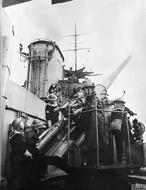 The QF 4.7 inch Gun Mark VIII[1] was a British naval anti-aircraft gun designed in the 1920s for the Royal Navy. This was the largest caliber fixed ammunition gun ever in service in the RN, though the round was considerably shorter and lighter than the round for the QF 4.5-inch Mk I – V naval gun. It was carried in powered HA XII mountings on the two Nelson-class battleships, two of the three Courageous-class aircraft carriers, the minelayer HMS Adventure, and the Australian seaplane tender HMAS Albatross.[2]