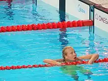 Rūta Meilutytė (Lithuanian pronunciation: [ruːˈtɐ mʲɛɪ̯ɫʊˈtʲi̇̂ːtʲeː]; born 19 March 1997) is a Lithuanian swimmer.[2] An Olympic gold medalist, she is a world record holder in the short course 50 metre breaststroke, 100 metre breaststroke and long course 50 metre breaststroke. She is a former world record holder in the long course 100 metre breaststroke.