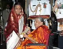 ![]() Nagarathnamma receiving the Padma Shri Award from President Pratibha Patil in 2012 | |