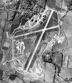 The airfield was then closed while contractors enlarged it. The works were completed by January 1944 when the USAAF Ninth Air Force moved in. They used the airfield for maintenance work, mainly on Lockheed P-38 Lightning fighters and the photo-reconnaissance version, the F-5, and North American P-51 Mustang fighters.[3] Their main use for the airfield appears to have been the testing of wire mesh as a runway surface, and some intensive testing was done from March to May, mainly with large numbers of Republic P-47 Thunderbolts and several Douglas C-47 transports.[2]