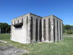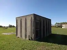 The control hut is made of concrete 12 inches (300 mm) thick and is approximately 19 by 22 feet (5.8 by 6.7 m). It stands close to the park edge at Boggy Creek, aligned southwest-northeast. The rectangular plan is divided into even quarters with three enclosed rooms and an open entry courtyard in the southwest quarter. There are two doorways off the open courtyard, protected by a freestanding blast wall. The door to the northwest opens into a fully enclosed room (former workshop and store) which connects to a room to the northeast (former indicator loop room). The storeroom contains an uninstalled louvered timber door, leant up against the wall. The indicator loop room has a single narrow unglazed observation window at eye height on the northeast corner. This narrow opening is sheltered by an external cantilevered tapered concrete hood.[1]