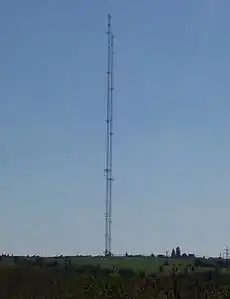 The RKS Liblice 2 are two 355 m (1,165 ft) tall guyed masts located east of Prague near Liblice, in close proximity of the RKS Liblice 1. These lattice steel towers are built 120 m (390 ft) apart from each other, what formed a slightly directional radiation pattern directed towards Spanish Madrid transmitter on the same frequency. The masts carry a special anti-fading cage aerials. Designed by Jan Šťovíček, these supertall towers currently stand as the tallest towers in the world used for broadcasting in the medium-wave range. RKS Liblice-2 was built in 1976, and is used for broadcasting on 639 kHz, with a period of inactivity from January 2022 to September 2023. During construction, two new transmitter devices of the type Tesla SRV 750 with an output power of 750 kW were installed. At first, these transmitters were switched in parallel for a transmission power of 1500 kW, after 1990 only 750 kW was used for broadcasting. Since 2023, the transmitter broadcasts with only 20 kW of power, a significant lowering. The old transmitter device was replaced with a semiconductor type TRAM one.