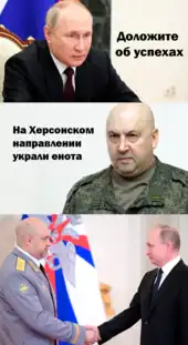 An example of a meme about the raccoon. In the meme, Russian president Vladimir Putin asks his general Sergey Surovikin to report on military successes. Surovikin responds by saying "a raccoon was stolen in the Kherson direction", leading to him being congratulated by Putin with a handshake.[3]
