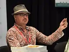 Growing up in Mexico City, Rafael López was immersed in the rich cultural heritage and native color of street life.[23] Influenced by Mexican surrealism and myths he developed a style with roots in this tradition. Using bold colors, his textured work is a fusion of graphic style and magical symbolism.[24] López likes to find objects and symbols to communicate concepts.[25] The illustrator is inspired by imagery from different cultures where he gathers ideas to inform the visual language of his works.[26] He paints with acrylic paints that come in large recycled salsa jars from Mexico[27] and uses a variety of objects to scratch textures onto hand-cut and sanded wooden boards.[28] Color and texture is important to Lopez's paintings[29] and he uses a camera to catalogue the colors, textural history of walls and peeling paint to fuel his work. López believes color is an expression of his identity, heritage and a direct route to the emotions of his audience.[30] He cites Mexico as a land of contrasts, surrealism, intense color, texture and imagery .[31] Strongly influenced by indigenous cultures and naïve art, his illustrations for children's books have been cited for their folk art quality.[32] He has created artwork for international clients like Amnesty International, Apple, Atheneum Books for Young Readers, Charlesbridge Publishing, Chicago Tribune, Grammy Awards, Harper Collins, Henry Holt & Company, Houghton Mifflin Harcourt, IBM, Intel, Lee & Low books, Library of Congress, Little, Brown and Company, Los Angeles Times, Penguin Books, Scholastic, The New York Times, United States Forest Service, United States Postal Service,[33][34] the Washington Post and the World Wildlife Fund and his work has been selected into multiple juried shows. Illustrations have been featured in publications like Communication Arts, the American Illustration Annual, and Graphic Design USA.[35]