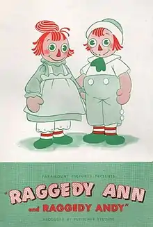 Raggedy Ann and Raggedy Andy is a two-reel cartoon produced by Fleischer Studios and released on April 11, 1941. It was co-written by Johnny Gruelle's son, Worth.[1] It was the first Paramount cartoon to feature Raggedy Ann. This cartoon marks the only appearances of her brother Raggedy Andy and The Camel with the Wrinkled Knees. The cartoon depicts Raggedy Ann and Andy as sweethearts as opposed to siblings in the books.
