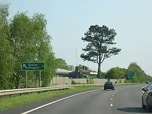 Raglan railway station was a station on the Coleford, Monmouth, Usk and Pontypool Railway. It was not opened when the line was originally built, but constructed in 1876 to replace two previous stopping places, Raglan Footpath, a small station which was situated a little further west, and Raglan Road, an unofficial halt which closed in July 1876 and was reopened as 'Raglan Road Crossing Halt' in November 1930 by the Great Western Railway.[1] The station was 6 miles and 34 chains from Monmouth Troy and was intended to improve the railway facilities at the nearby village of Raglan, which was the site a large castle[2] which provided a steady stream of tourist traffic. It was closed in May 1955 due to a train drivers strike and was never reopened though a couple of special services continued to run along the stretch of track over the next few years, including a centenary special organised by the Stephenson Locomotive Society in 1957.[1]