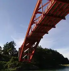 This is a deck arch bridge made of steel, built in 1957, with a total length of 242.90 metres (796.9 ft) and a main span of 176.80 metres (580.1 ft).[1] There is 75 feet (23 m) of clearance below the bridge, above Swinomish Channel[2]