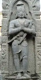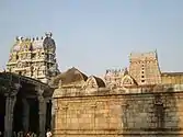 The originally temple was first constructed by Kulothunga Chola I(1070-1125 A.D.) stone inscription found in the site.[6] The place Mannargudi is termed Sri Rajathi Raja Chathurvedhi Mangalam[7] and the town started to grow around the temple. Successive kings of the Chola empire, Rajaraja Chola III, Rajendra Chola III and kings of Thanjavur Nayaks, Achyuta Deva Raya[8] expanded the temple. The temple contains inscriptions of the Hoysala kings and some Vijayanagara grants, and many records of the later Nayaks and Marathas.[9] The Thanjavur Nayaks made the temple as their dynastic and primary shrine and made significant additions.[10] The current temple structure, hall of 1000 pillars, main gopuram (temple gateway tower) and the big compound wall around the temple was built by the king Vijayaraghava Nayak(1532-1575 A.D.).[6] Raghunathabhyudayam, a doctrine by Nayaks explains the donation of an armour studded with precious stones to the main deity by the king.[8] He erected the big tower in the temple so that he can view the Srirangam Ranganathaswamy temple from the top of Mannargudi. The Nayaks were specially interested in music and it was promoted in both the temples. Instruments like Mukhavina, Dande, Kombu, Chandravalaya, Bheri and Nadhasvaram were commonly used in the temple service.[11]