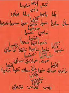 Baghar, Bhaabhan, Bhaudinja, Chooharja, Dangeja, Daharja, Deenarja, Dodayja, Gagangja, Husinja, Haji, Jamerja, Jaara, Sameja, Jeendayja, Jeeyapota, Jogi, Jubairja, Khairayja, Kubar, Lakheja, Lakhuja, Meharja, Makai, Mojai, Maandar, Moheyja, Mulla, Mudafarja, Nangor, Paata, Pasaaya, Patuja, Puryari, Saheja, Sahaypota, Sadar, Samdani, Samaa, Samaari, Sanjarja, Sadri, Salaarja, Shahbaigja, Shiekuja, Tugruja, Uddheja, Veesar, Wedhar and Wadhaari.[6]
