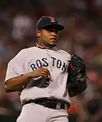 On November 19, Ramírez was traded to the Boston Red Sox for outfielder Coco Crisp.[34] On April 24, 2009, he pitched a scoreless inning for the Red Sox and earned the win in an 11-inning 5–4 victory over the New York Yankees.[35] He began his Red Sox tenure with 15 straight scoreless innings spanning 13 games from April 8 to May 3.[36] On May 14, he pitched a season-high 2+2⁄3 innings, giving up no runs in a 12-inning, 5–4 loss to the Los Angeles Angels of Anaheim.[37] He struck out a season-high four batters and allowed a run in 1+2⁄3 innings on July 9 in an 8–6 loss to the Royals.[38] Ramírez finished the season with a 7–4 record, a 2.84 ERA, 52 strikeouts, and 69+2⁄3 innings pitched. His seven wins were tied for third among AL relief pitchers and trailed only Alfredo Aceves (10) and Craig Breslow (8).[36] Ramírez reached the playoffs for the first time in his career, as the Red Sox won the Wild Card. In Game 1 of the American League Division Series (ALDS), he gave up two runs without recording an out in his only playoff appearance, a 5–0 loss to the Angels.[39] The Angels went on to sweep the Red Sox in three games.[40]