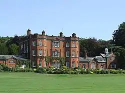 There are two structures associated with the house that have been listed at Grade II. The gate piers date from the early 18th century, and the gates from the later part of the same century. The piers are in rusticated yellow sandstone ashlar.[5] Each supports a trophy in Portland stone, consisting of an eagle supporting a shield with a boar's head crest.[1][5] The gate piers and gates were moved to the house in the 1950s by Stanley Harrison, the owner of the house at that time.[1][6] Immediately to the east of the hall is a two-storey timber-framed house, originating in the 16th century, with later additions and alterations. The timber-framing infill is a mixture of brick and wattle and daub.[7]