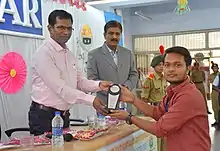 The then Director of technical education Hon. K K Nirala Sir felicitating a student in Aavishkar event.