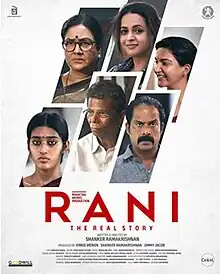 Rani: The Real Story[1] is a 2023 Indian Malayalam-language investigative mystery thriller film written and directed by Shankar Ramakrishnan and jointly produced by Vinod Menon and Shankar Ramakrishnan[2] under the banner of MagicTail Works Productions and co-produced by Jimmy Jacob of June Ventures.[3] The film has an ensemble cast of leading actors like Indrans, Guru Somasundaram, Maniyanpilla Raju, Ashwin Gopinath, Ashwath Lal, Bhavana, Niyathi Kadambi, Honey Rose, Urvashi,[4] Anumol, Maala Parvathy, alongside Krishnan Balakrishnan, Ambi Neenasam, Ramu Mangalapalli, Athira Sreekumar in supporting roles.