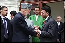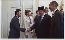 During his travel to OIC member countries, Hussain has held meetings with a number of leaders,[27] including President Karzai of Afghanistan,[28] President Gul of Turkey,[29] King Abdullah of Saudi Arabia, President Susilo Bambang Yudhoyono of Indonesia, Prime Minister Najib of Malaysia, President Zardari of Pakistan, Prime Minister Aziz of Mauritania, President Sall of Senegal, President Buhari of Nigeria,[30] and OIC Secretary General Ihsanoglu.[31] Hussain also attended the OIC Heads of State Summit in Egypt and in Mecca, Saudi Arabia is 2012, where he met with a number of leaders, including a pre-dawn Ramadan meal with King Abdullah of Saudi Arabia, and held other meetings with President Gul of Turkey and President Karzai of Afghanistan. They discussed a number of issues, including Syria, the democratic transitions in the Middle East and North Africa, and U.S. engagement with Muslim communities around the world.[32] Hussain also led an international peacemaking delegation to the Central African Republic in 2014 to meet with President Samba-Panza and civil society leaders.[33]