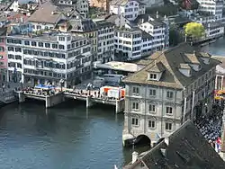 The first extensions of the medieval wooden bridge were carried out in 1375 and 1420/21. The medieval bridge was wider than necessary, and housed the mills of the Oetenbach Nunnery, as shown by the altarpiece of the Grossmünster Zwölfbotenkapelle by Hans Leu. Only the breakwaters at the inflow side were built of stone, which can be seen on the Murerplan. All other sections of the bridge consisted mostly of wood. As Schipfe expanded, it became necessary to expand the bridge to accommodate the new traffic. From 1602 to 1605 the bridge was rebuilt with the present dimensions. the bridge was bound on the east by the former Hotel Zum Schwert (now a commercial building), and in the west with a wooden platform made of oak planks. The bridge section between the town hall and the Hauptwache was rebuilt from stone. From 1881 to 1893, the remaining wooden bridge was replaced by a cast-iron construction. The old stalls and shops were slowly replaced by modern commercial buildings, including a café and sanitary installations.[3] In 1972, it once again became necessary to rebuild the bridge. The new design, made of reinforced concrete, was designed by the architect Manuel Pauli and completed in 1973.