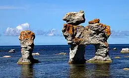 Rauks are common on the island of Gotland, Sweden and on the smaller islands belonging to Gotland County.[1] Fårö island in Gotland, is particularly rich in rauks.[2] While Fårö is on the northern end of Gotland Holmhällars raukfält at Vamlingbo in the southern end of Gotland is also rich in rauks.[3] Rauks in Gotland often occur in groups or fields, so-called raukfält.[4] Rauks can be found both near Gotland's many cliffs or far away from these.[5]