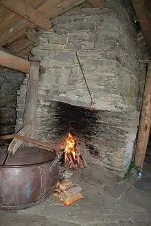 The Raudsjø Valley lies high in the mountains, at an elevation of 900 meters (3,000 ft),[7] and is difficult to access. Construction began on June 12, 1856. A team of 37 workers and 38 horses stayed for three weeks to build the large stone dairy building.[2][8] In addition, the dairy was equipped with a barn that could accommodate 100 cattle.[2][3] In addition to a cheese-making room with an open hearth, the dairy building also had a milk house and a storage room for the finished cheese (an Emmental cheese).[3]