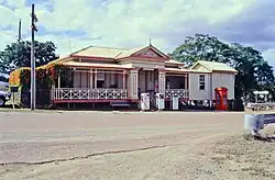 The front verandah and entrance to the Post Office and store are reached by steps up to a classically inspired central entrance formed of a triangular timber pediment supported by square timber pillars. The imposing effect created by this entrance is somewhat diminished by the presence of three petrol bowsers in front of the stairs.[1]