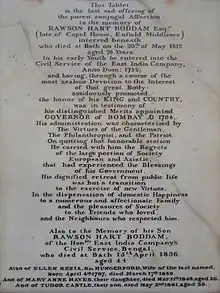 Rawson Hart Boddam was the first Governor of Bombay to be paid entirely by salary, at an annual rate of nearly £10,000. By a second wife, Eliza Maria Tudor, he had nine children, and settled at Capel House, Bull's Cross, near Enfield on his return to England.[4] He died 'aged 78 years' in May 1812.[1] In the 1920s a portrait was in the possession of Mrs. Hungerford Meyer Boddam, of Capel House, Guildford.[4]