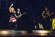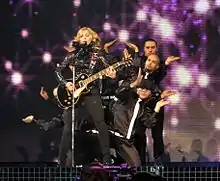 "Ray of Light" has also been featured in the set lists of four Madonna tours – 2001's Drowned World Tour, 2006's Confessions Tour, 2008–2009's Sticky & Sweet Tour, and 2023-2024's The Celebration Tour. On the Drowned World Tour, it was included as the fifth song on the Neo-Punk segment, where the singer performed it wearing punk inspired clothing, and the backdrop screens showed an extended version of the song's music video. This time, the electric guitar was played by Monte Pittman.[98] Michael Hubbard from MusicOMH noted that "things quickly hotted up with [...] 'Ray Of Light', a track that was quite simply as sublime as it was infectious".[99] In 2005, Madonna performed "Ray of Light" during the Live 8 benefit concert,[100] and a year later at the 2006 Coachella Valley Music and Arts Festival in Indio, California.[101] During her 2006 Confessions Tour, Madonna included a rock version of "Ray of Light" as the second song of the show's third act, the Glam-Punk segment. For this performance the singer played the electric guitar and urged the audience to jump-along. She was accompanied by six male backup dancers, dressed in black outfits and white ties doing a synchronized choreography.[102] Rolling Stone called the performance "hard-rocking".[103]