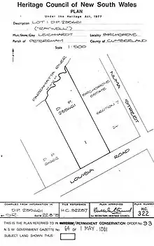 It is sited prominently on the ridge of Long Nose point with sweeping harbour frontage and views spanning from the West towards the Gladesville Bridge, Hunters Hill, Cockatoo Island and Woolwich, North East towards Berry Island Reserve and to the south capturing the skyline of the City of Sydney and the Harbour Bridge. The frontage to Louisa Road is bounded by an attractive sandstone and palisade fence.[1]
