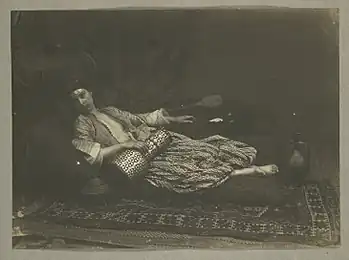 Fenton created around 50 photographs in the Summer of 1858, inspired by the exoticism of the Middle East and the orientalist artistic movement. These pictures were all staged in his studio in London. Fenton took inspiration in the depiction of odalisques and scenes from harems, from the Ottoman Empire and the Islamic world, as seen in the paintings of artists like Jean-Auguste-Dominique Ingres and Eugène Delacroix, and also possibly in the pictures recently taken by French pioneer photographer Félix-Jacques Moulin, in his trip to Algeria, in 1856, for staged pictures like this.[1][3][4][5] Other photographers at the time, also inspired by orientalism, took a similar approach to Fenton.[6]