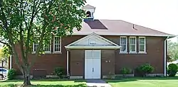 The Redford Township District No. 5 School is a one-story red brick school building with a hipped roof and a concrete foundation with raised basement.[2][4] The front facade is symmetrical, with a projecting vestibule sheltering the central main entrance, flanked by three six-over-one double-hung windows on each side. The side facades originally had single windows; however, these have been boarded over, as have the basement windows. The roof is crowned with a belfry with arched openings. Exterior decoration is minimal, with a single brick beltcourse separating the basement and main floor, and vertical piers on the front and sides.[2]