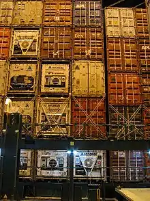Another refrigeration system sometimes used where the journey time is short is total loss refrigeration, in which frozen carbon dioxide ice (or sometimes liquid nitrogen) is used for cooling.[3] The cryogenically frozen gas slowly evaporates, and thus cools the container and is vented from it. The container is cooled for as long as there is frozen gas available in the system. These have been used in railcars for many years, providing up to 17 days temperature regulation.[4] Whilst refrigerated containers are not common for air transport, total loss dry ice systems are usually used.[3] These containers have a chamber which is loaded with solid carbon dioxide and the temperature is regulated by a thermostatically controlled electric fan, and the air freight versions are intended to maintain temperature for up to around 100 hours.[5]
