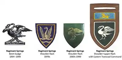 Regiment Springs was formed in March 1972 and descended from Regiment Oos Rand as its 2nd Battalion, which in turn was raised in January 1964 in Benoni. The regiment was relocated to Springs and took its current name in March 1972.