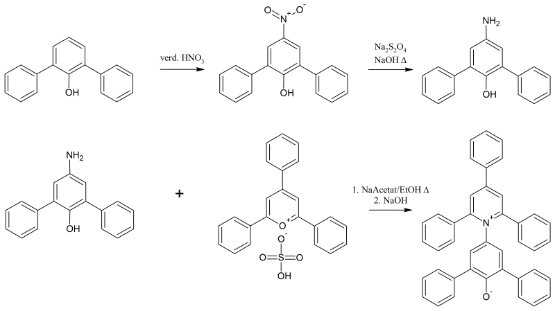 2,6-Diphenylphenol is nitrated with diluted nitric acid to 4-nitro-2,6-diphenylphenol and subsequently reduced with sodium dithionite to the amine. This is reacted in presence of sodium acetate in ethanol with 2,4,6-triphenylpyryliumhydrogensulfate to the hydrogen sulfate of the dye and the betaine is formed by adding sodium hydroxide.
