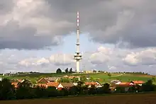 Reisenbach Telecommunication Tower ( German designation: Fernmeldeturm Reisenbach) is among the tallest structures in the Northern parts of Baden-Württemberg. Only the two masts of Donebach longwave transmitter are taller in the Mudau community. As the masts of Donebach transmitter, Reisenbach Telecommunication Tower is property of Deutsche Telekom AG.