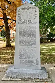To commemorate the massacre a monument was installed in the town square of Harrison, Arkansas. It was unveiled during a Fancher Family reunion on September 4, 1955.[51][52][53] On one side of this monument is a map and short summary of the massacre, while the opposite side contains a list of the victims.