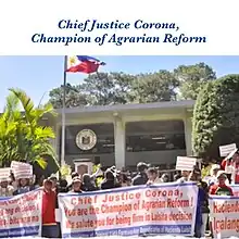 In November, 2011, the Supreme Court, headed by Corona, issued a landmark decision on the Hacienda Luisita case, wherein, under agrarian reform laws, the Court upheld both the distribution of land to the hacienda's farm workers and the revocation of the SDO agreement forged in 1989.[2][3] The Cojuangco group was given a ten-year window to distribute the lands to the farmers as stipulated.[4]