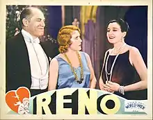 Reno is a 1930 American pre-Code drama film directed by George J. Crone and starring silent serial queen Ruth Roland. It was produced and distributed by early sound era production studio Sono Art-World Wide Pictures. Roland's sound film debut, she would follow up with only one more talkie.[1]
