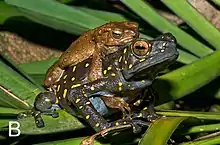 Adult males measure 70–79 mm (2.8–3.1 in) and adult females 99–102 mm (3.9–4.0 in) in snout–vent length. The snout is angular, truncate in dorsal profile, but slightly projecting beyond the lower jaw in lateral profile. The eyes are large. The tympanum is distinct. The fingers have basal webbing and large terminal discs. The toes are webbed and bear small terminal discs. Females have mostly smooth skin. The base color is light yellow, which turns dark grey when stressed and/or handled. There are bright yellow spots on the back, side of head, flanks, dorsal surface of limbs, gular, ventrolateral region, and chest. Males are uniform brown to orangish and lack distinct patterns, but have a higher degree of tuberculation.[1]