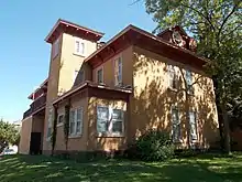 When the house was built in the late 1860s, it appears to have followed the Italianate style.[2] This is suggested by the three-stage tower still visible at the back of the house. It features a low, bracketed hipped roof typical of the style. The house sits perpendicular to the street and may have faced a great lawn to the south. The back of the house faces Fifteenth Street. It was converted to the Colonial Revival style when it was renovated in 1905.[2] It features a symmetrical façade and a hipped roof with dormers. The dormers themselves have a gable roof that features partially returned cornices and fluted pilasters that flank the small windows. Egg-and-dart and denticular moldings are found on the house's main cornice. The columns on the main porch follow the Doric order. To the right of the porch is an irregularly shaped solar that has stained glass transom panels over tall windows.