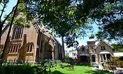 The relationship of the building to its neighbours contributes to its interest. The building and its immediate neighbours are distinguished from later buildings in the street by their deep setbacks. The deep setbacks and generous grounds also provide a setting appropriate to the magnificence of the architecture. Although little remains of the original front gardens these setbacks, and the large trees surrounding, provide a suitable setting for such a grand architectural statement and contribute to the Gothic atmosphere of the main frontage. Some of the site's trees appear to date back to the original construction.[11][1]