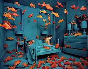 Like many of her other works, such as Radioactive Cats and Fox Games, the piece is a set composed of props and human models, which Skoglund poses and then photographs.[1] In the piece, a child sits on the edge of a bed while an adult sleeps next to him. The set of the scene is a monochromatic blue, with contrasting bright orange goldfish floating through the room. The goldfish in the piece were sculpted by Skoglund out of terracotta and bring an element of fantasy to an otherwise normal scene.[1] According to Skoglund, "If the fish are eliminated the image shows nothing unusual; just a room with two people in bed.”[2]