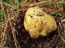 Their fruiting bodies (basidiocarps) are truffle like and 1–4 cm in diameter when dried with a yellow 60-240 um thick peridium and pale yellow gleba.[6][2] These structures stain reddish with injury[7] Their basidia are clavate and contain 6 or 8 spores.[8] The spores are smooth, ellipsoidal and 7-9 by 3-5 um.[2] They have white hyphae 2–5 mm in width and 5-25 um in length with simple dichotomous branching and thick rhizomorphs.[9] They lack clamp connections and deposits of what is thought to be calcium oxalate found on the mantles of some other members of their genus.[8][10]